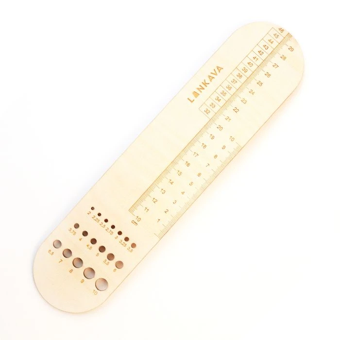 Mittaan on kaiverrettu senttimetrien lisäksi sukkien kokotaulukko väliltä 32-46. Jalan pituuden voit mitata kätevästä seisomalla mitan päällä.