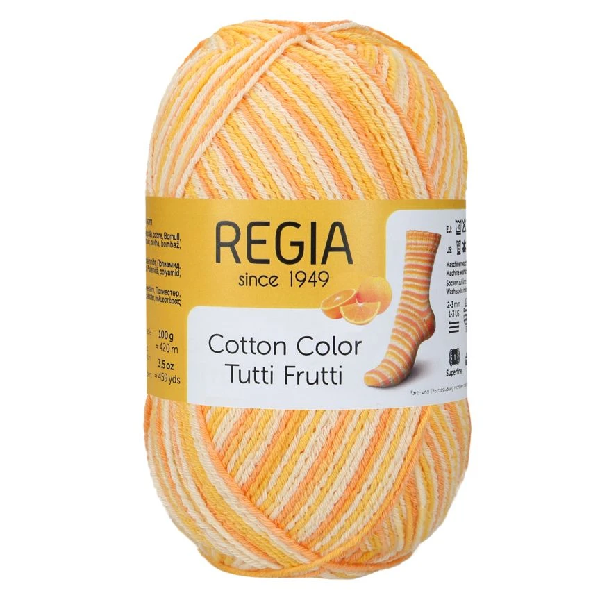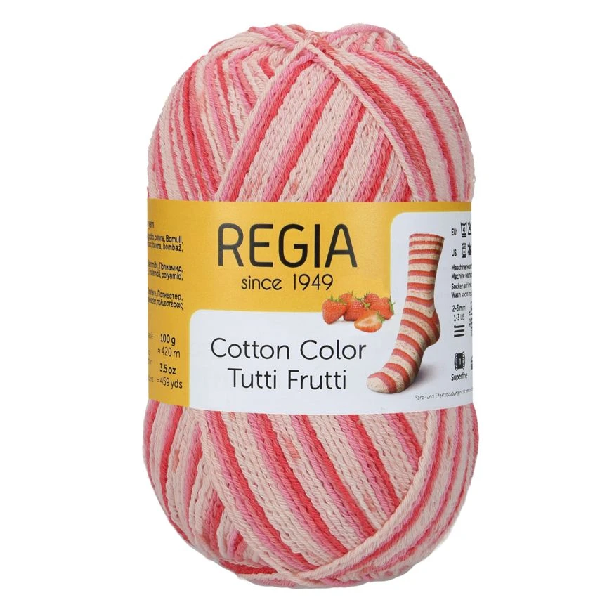 Regia Cotton Color Tutti Frutti on puuvillainen sukkalanka, josta neulot pirteät kesäsukat hedelmäisen herkullisissa väreissä.